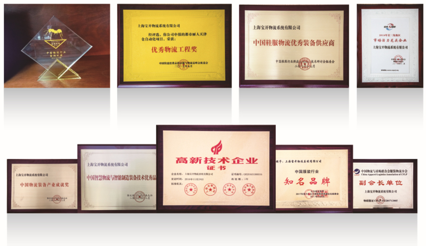 作為上海市高新技術(shù)企業(yè)、ISO認(rèn)證企業(yè)、雙軟認(rèn)證企業(yè) ,寶開多項(xiàng)核心技術(shù)已獲得國家專利,同時(shí),寶開是中國物流與采購聯(lián)合會(huì)服裝物流分會(huì)副會(huì)長單位,中國倉儲(chǔ)配送協(xié)會(huì)家居物流分會(huì)會(huì)員單位,《物流技術(shù)與應(yīng)用》雜志理事單位,榮獲“2016年長三角地區(qū)市場活力龍頭企業(yè)”、“2016-2017年度中國物流行業(yè)金螞蟻獎(jiǎng)”、“全國發(fā)明金獎(jiǎng)”(AS/RS立體倉庫系統(tǒng)在紡織行業(yè)的應(yīng)用)、“2018致敬改革開放中國鞋服供應(yīng)鏈與物流優(yōu)秀集成商”、“2018中國制造業(yè)優(yōu)秀物流工程獎(jiǎng)”、“2019鞋服供應(yīng)鏈與物流優(yōu)秀供應(yīng)商”、“2019物流裝備產(chǎn)業(yè)產(chǎn)品技術(shù)創(chuàng)新獎(jiǎng)”、2020年吳涇地區(qū)“創(chuàng)新活力獎(jiǎng)”等多項(xiàng)榮譽(yù)。