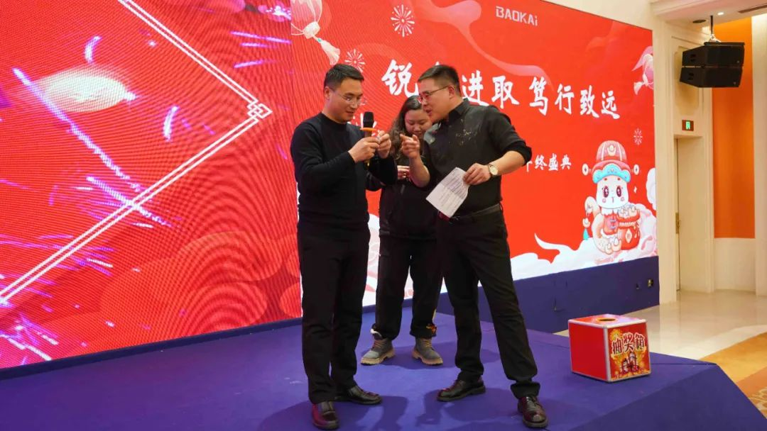 當晚,寶開2025年終盛典在白金漢爵大酒店召開。營銷部宋龍、財務部丁俊營擔任主持人。